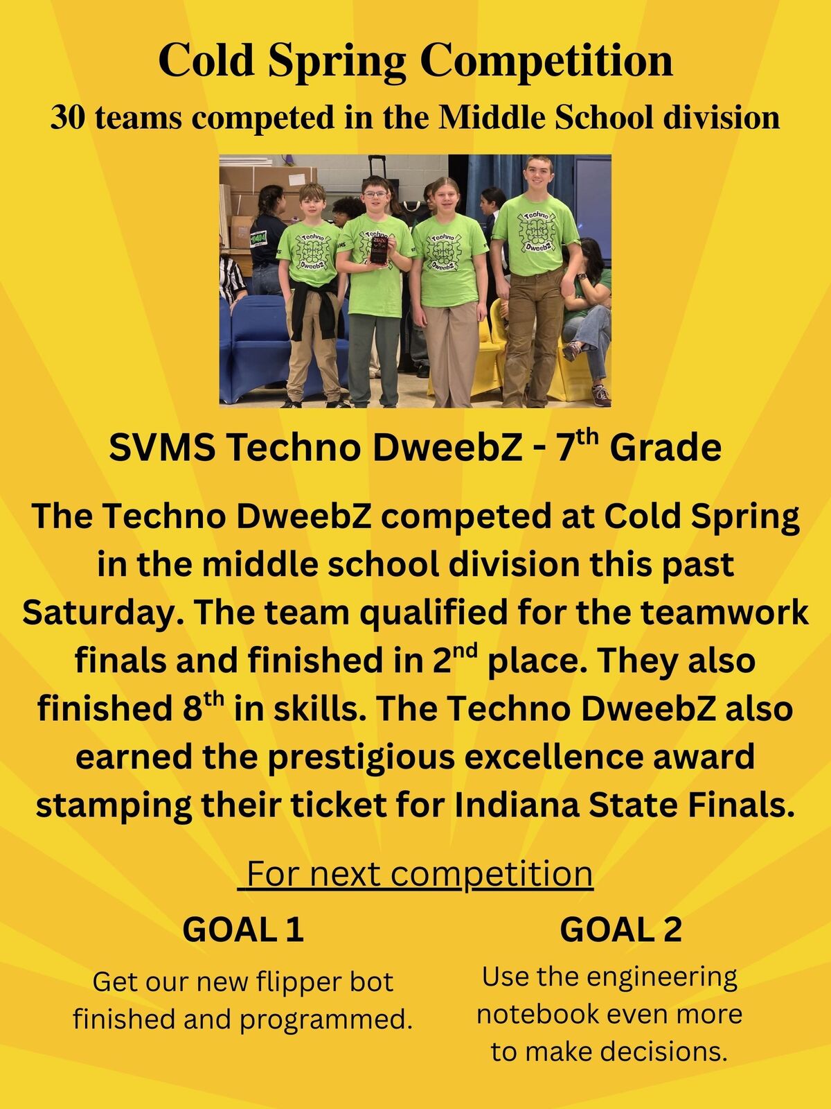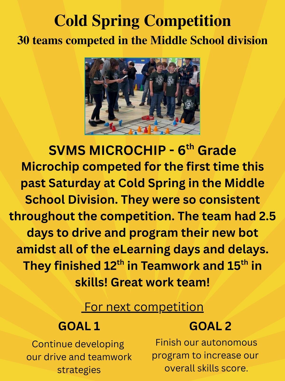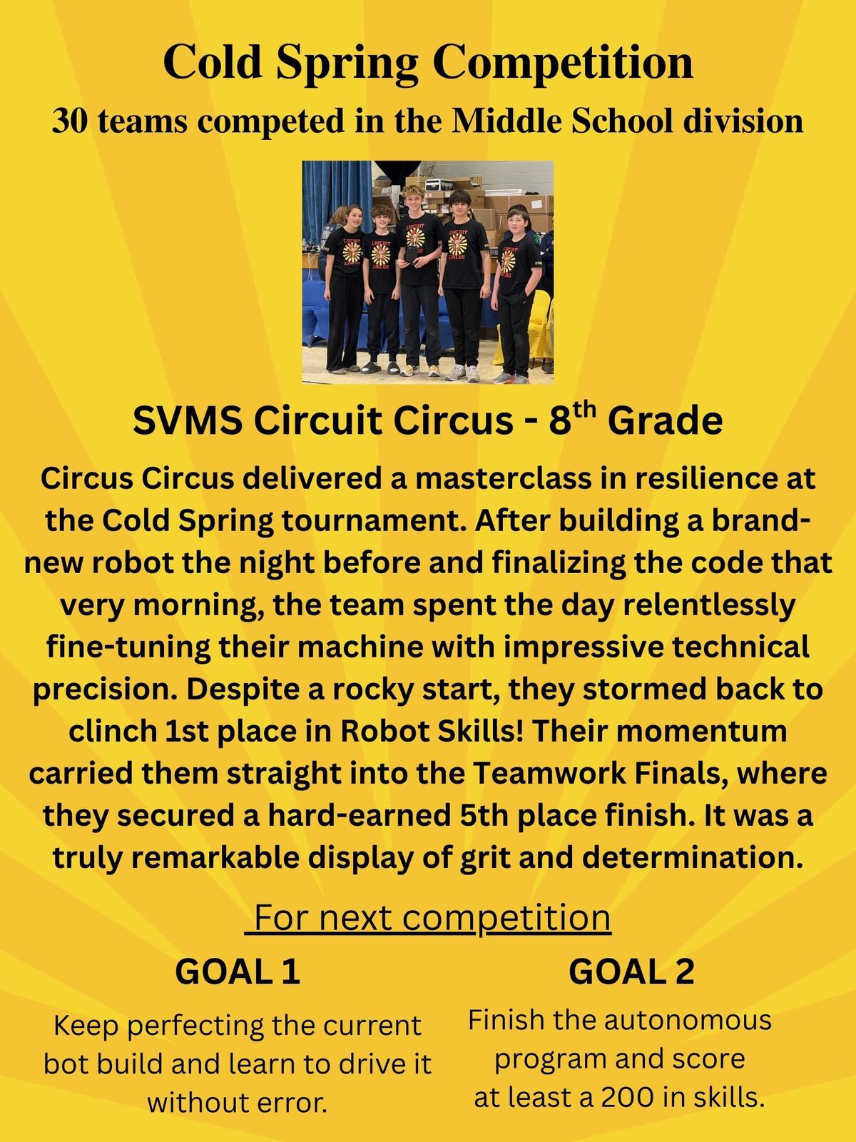 Our teams showcased incredible talent and grit this past Saturday at the Cold Spring tournament! The Techno DweebZ led the charge in the Middle School Division, finishing 2nd in Teamwork and 8th in Skills while securing the prestigious Excellence Award to punch their ticket to the State Finals. Circus Circus pulled off a masterclass in resilience, overcoming a rocky start to clinch 1st place in Skills and a 5th place finish in the Teamwork Finals. Meanwhile, Team Microchip displayed impressive consistency despite limited practice time, finishing 12th in Teamwork and 15th in Skills. In their debut performance, Build a Tech brought home a strong 4th place in Skills and 20th in Teamwork with a flawlessly executed autonomous routine. Across the board, our students proved their technical skill by engineering, programming, and fine-tuning bots under immense pressure. We are so proud of these innovators—keep an eye on them as they continue to dominate this season!